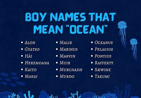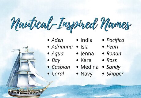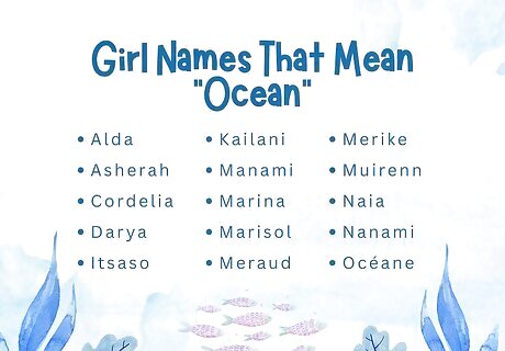 Choose a name inspired by the sea. If you don’t like any names that mean “ocean” directly, Dr. Wilson suggests looking at nature-inspired names, like Coral, Isla, or Sereia. These names remind us of the sea, even if they technically mean something different. Here are some other examples: Aden (English for “little fire;” after the Gulf of Aden) Adrian (Latin for “from Hadria;” after the Adriatic Sea) Adrianna (Latin for “from Hadria;” after the Adriatic Sea) Anchor (English for “stability”) Aqua (Latin for “water”) Aegle (Greek for “light;” after the Aegean Sea) Bay (English for “sea inlet”) Caspian (Greek and Latin for “from Qazvin;” after the Caspian Sea) Coral (Latin for “sea organism, small stone”) India (Latin and Sanskrit for “the Indus River;” after the Indian Ocean) Isla (Scottish for “island”) Jenna (English for “white wave”) Kara (Italian for “beloved;” after the Kara Sea) Medina (Arabic for “city;” after the Mediterranean Sea) Navy (British for “a fleet of ships, dark blue”) Pacífica (Spanish for “peacemaker;” after the Pacific Ocean) Pearl (English for “gem formed in a mollusk”) Ronan (Irish for “little seal”) Ross (Scottish and English for “headland;” after the Ross Sea) Sandy (English for “of sand”) Skipper (English for “boatman”) Timor (Malay for “east;” after the Timor Sea)