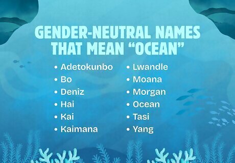Go for a name that could work for any gender. Whether you’re unsure of your baby’s gender or you simply prefer gender-neutral names, there are plenty of unisex ocean names from across cultures. Here are some interesting options: Adetokunbo (Yoruba for “came from across the sea”) Bo (Chinese for “wave”) Deniz (Turkish for “sea”) Hai (Chinese for “sea”) Kai (Hawaiian for “sea”) Kaimana (Hawaiian for “power of the sea”) Lwandle (Zulu and Xhosa for “ocean”) Moana (Polynesian for “ocean, sea”) Morgan (Welsh for “sea circle”) Ocean (English for “ocean”) Tasi (Chamorro for “ocean”) Yang (Chinese for “ocean”)
