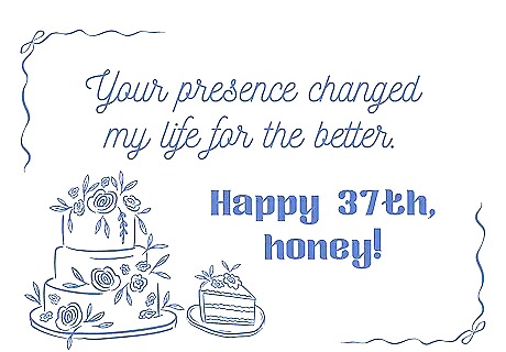 State what you love about your wife to make her feel adored. Telling your wife that you love, appreciate, and care about her never gets old, no matter how long you’ve been together. Take a moment to share how she’s impacted your life, and don’t be afraid to be vulnerable or a little sappy—that way, she’ll know it’s coming straight from your heart! It's your birthday, baby, which means your wish is my command. Your presence changed my life for the better. Happy 37th, honey! On a scale of 1 to 10, you’re a 98321748306. Happy birthday, gorgeous! Being with you feels like winning the lottery every day. Happy birthday, my love! You make me complete. Happy birthday to the best thing that ever happened to me. You in my arms? Best feeling ever. You under me? Even better. Happy birthday, wifey. I never thought I could find someone as special as you. Happy 37th birthday to the love of my life. When I look at you, I see the entire universe. Happy birthday to someone who makes life worth living. Every time you walk past me, I have to remind myself to behave. Happy birthday to my favorite distraction. I still can’t believe I married the smartest, sexiest, and most stunning woman alive. Happy 37th birthday, sweetheart! You are more than just my wife… You’re the heartbeat of my life, the love in my soul, and the beauty in my world. Happy birthday, darling. Marrying you was the easiest and best decision I’ve ever made. I’m so lucky to grow old with you, and I can’t wait to see where our story goes. Happy 37th, baby.