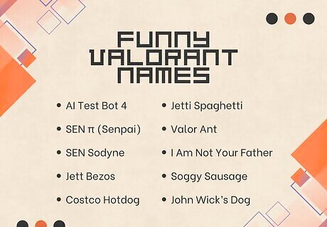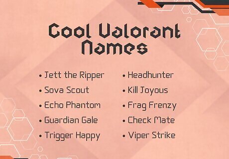 Pick something cool and unique. If funny names aren’t really your thing, go for something that has a little more edge. Many of these names reference different Valorant characters or gameplay while still sounding creative and cool. Here are some examples: Jett the Ripper Snipe Sage Sova Scout Reyna Reign Echo Phantom Venom Viper Guardian Gale Stealth Slayer Trigger Happy Cipher Seeker Headhunter Bad Karma Kill Joyous Thunderstruck Frag Frenzy Dodge This Check Mate Shadow Reign Viper Strike StormX