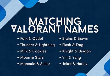 Choose matching names with your favorite teammate. Whether you play with your friend, your partner, your sibling, or anyone else, let other Valorant players know you’re a package deal by choosing matching names. These can be funny or serious depending on your preference. Here are some examples: Fork & Outlet Apple Bottom Jeans & Boots With the Fur Emotional Support & Emotional Damage Thunder & Lightning Drama Queen & King of Cool Her Chaos & His Peace Milk & Cookies Moon & Stars Mermaid & Sailor Brains & Brawn Flash & Frag Sova Arrow & Cypher Cam Spike Planter & Spike Defuser Phantom Striker & Vandal Vanguard Knight & Dragon Cookie Monster & Elmo Big Spoon & Little Spoon Yin & Yang Joker & Harley I’m With Stupid & Stupid