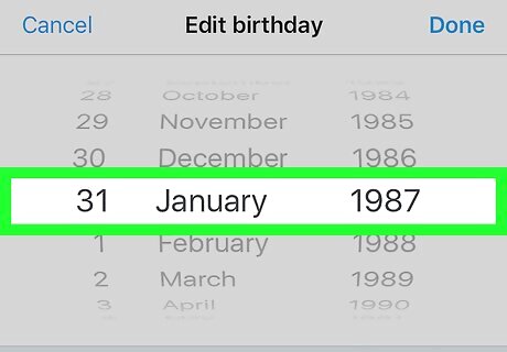 Select the month, day, and year of your birthday. You’ll do this by scrolling up or down on the three wheels until the correct options appear at the center.