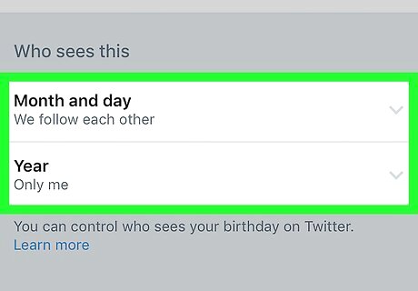 Control who can see your birthday. You’ll see two privacy options under “Who Sees This.” Tap Month and day to choose who can see your exact birthday. Tap Year to choose who can see your birth year. If you don’t want anyone to know how old you are, select Only me for this option.