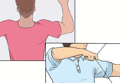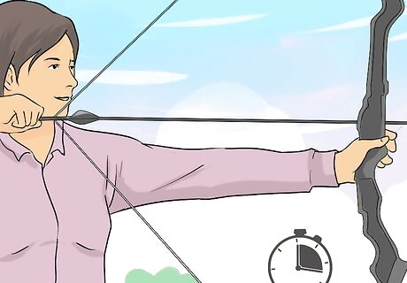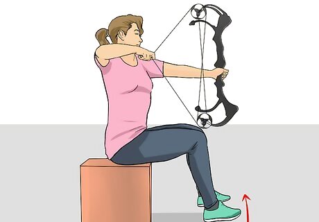 Draw the bow with your feet off the ground. Some archers use this method to test how comfortable they are with their bow’s draw weight. Sit in a chair and raise the bow in front of you as if you were sighting a target. Now, pick your feet up off the ground and hold them up as you pull back the bowstring. Observe how easy or difficult this feels. Keeping your feet off the floor reduces your stability and shows you more clearly how much you’re relying on the muscles of your shoulders and back to draw. This test slightly overestimates the role of the upper body in drawing, holding and shooting, giving you more control when your feet are on the ground.