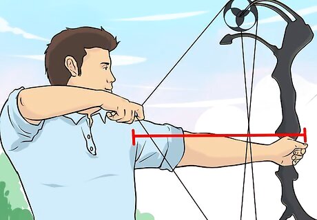Take your draw length into account. Draw length refers to the distance it takes to pull the bowstring all the way back. The longer the draw length, the more tension that is placed on the bow and the heavier the weight of the bowstring. Make sure your bow is properly calibrated to suit your body type and measurements. If need be, take the bow to a specialist to have it modified. The draw length of the bow should correspond directly to your arm span. Altering the bow’s draw length is more complicated, and may have to be done by a professional.