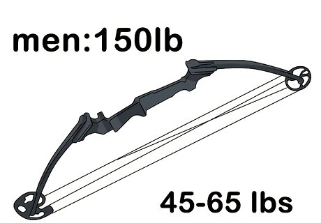 Use an average draw weight for reference. If you’re just getting started and aren’t sure what draw weight would be best for you, take a look at some average draw weights as they’re categorized by age and sex. Children generally start with a weight of around 20-30lbs; women weighing less than 170lbs and older boys fall around 30-40lbs; women weighing over about 170lbs, older boys, and men weighing 150lbs or less might use a weight anywhere between 45-65 lbs; men between 150-200lbs use an average of 60-70lbs; men over 200lbs might use up to a 100 pound draw weight. Try out different bow sizes and draw weights to see which you handle best. These are just average figures, and don’t reflect the abilities of an individual archer.