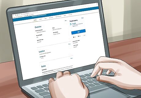 Pick a job and start the online application process. When looking through the open positions, make sure you check each jobs' minimum requirements, official duties and responsibilities, travel requirements, benefits, starting salary, and pay scale. Once you find a job you like, click the “Apply” button located near the top of the job page. If you don't already have one, you'll need to create a USA Jobs account to start the application process. Some jobs are only available to current federal employees, veterans, military spouses, and individuals with disabilities.