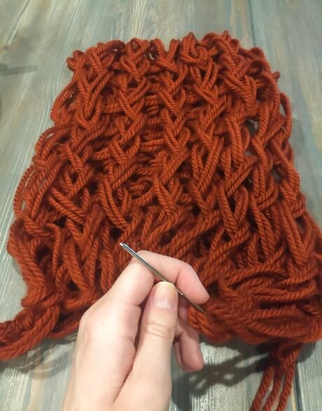 Repeat until all of the stitches from your left arm are now on your right arm. Remember, you should have the same number of stitches that you started with.