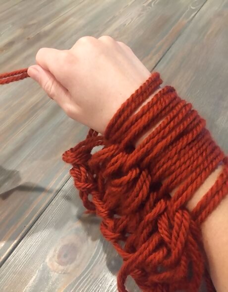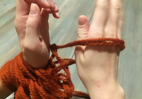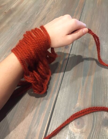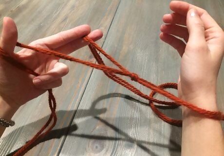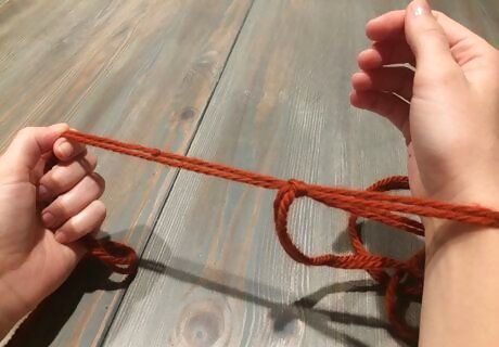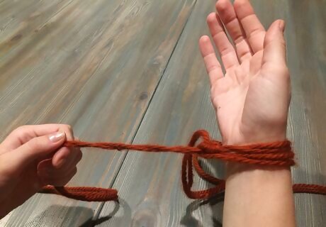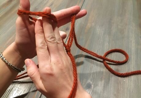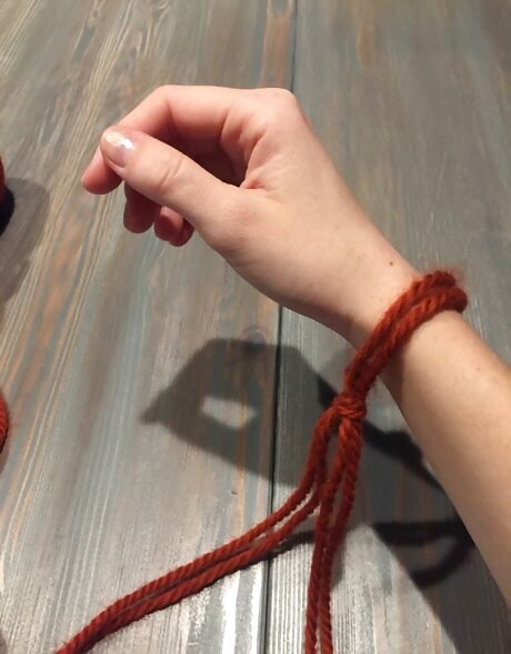 Pick up the first stitch on your right wrist with your left hand. Pull the loop over the yarn you are holding in your right hand, and let go. Do not let go of the loop you are holding in your right hand. Only release the yarn you pulled over with your left hand.