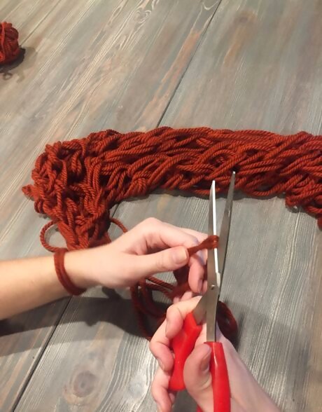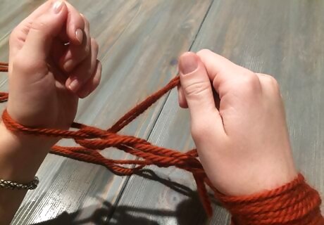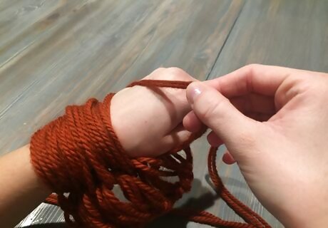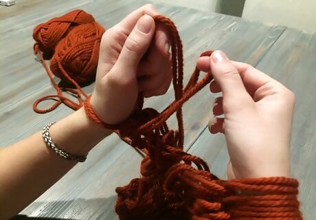 Repeat rows one and two until you have achieved the desired scarf length. Row one is moving stitches from your right arm to your left. Row two is moving stitches from your left arm to your right. Two skeins of yarn will make a scarf long enough to wrap around your neck once. If you want to make an infinity scarf, join another two skeins of yarn by tying them to the original skeins. Make sure you finish with row two so that the yarn is on your right wrist to start casting off.