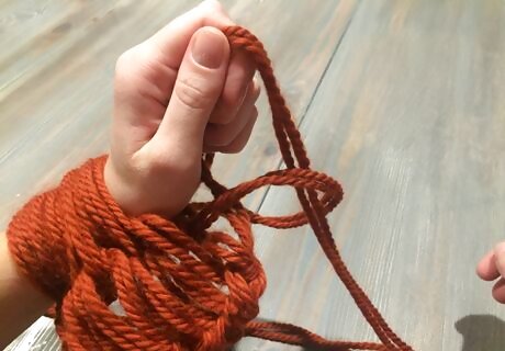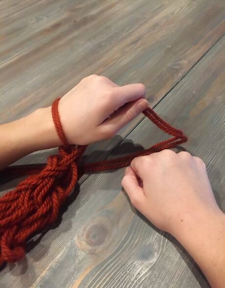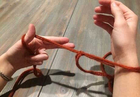 Pull the cut end through the final loop on your left arm, take the loop off of your arm, and pull tight.