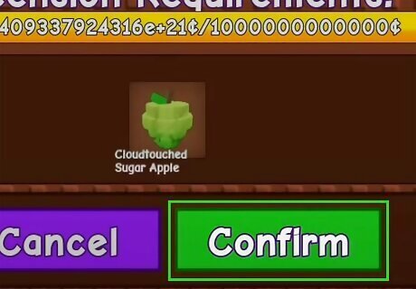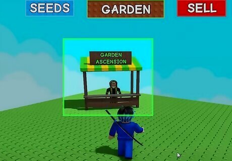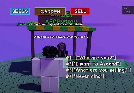 Talk to the NPC at the Garden Ascension shop. Go up to the shop and talk to the merchant, Orson. You’ll see several dialogue options: choose “I want to ascend.” This will pull up a screen that shows your rebirth requirements. You can find the Garden Ascension shop in the corner of the map near the Sell Shop. Go up to the merchant booth where you sell inventory, then look at the right corner of the map behind the shop. Some users have had trouble finding the Garden Ascension shop. If you don’t see the shop right away, check the area right around your garden, or wait a while—the shop may only appear at certain times, or you might need to reach a certain number of shekels before you can see it.