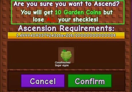 Click “Confirm” when you’re ready for your rebirth. After you click “I want to ascend,” you’ll see a notice that says, “Are you sure you want to ascend? You will get 10 Garden Coins but lose ALL of your shekels.” If you have the requirements and you’re sure you want to ascend, click “Yes.” You can use Garden Coins in the Garden Shop or Seed Shop Level 2. Every rebirth costs 1 trillion shekels and gives you 10 Garden Coins, no matter how many times you ascend. The only thing that will change is the fruit requirement. Be sure to spend as many shekels as possible before you ascend since you’ll lose anything that’s left. Note that you have to wait at least 24 hours before you can perform another rebirth. You can see how long you have left at the top of the “I want to ascend” menu where it says “Next Ascension.”