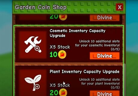 Buy upgrades in the Ascension shop. To see the list of upgrades you can buy in the Garden Ascension shop, talk to Orson the merchant and choose “What are you selling?” There, you can exchange Garden Coins for upgrades like: Save Slot Upgrade (50 Garden Coins): Add 1 save slot (1 available) Egg Capacity Upgrade (20 Garden Coins): Add 1 egg slot (5 available) Pet Inventory Capacity Upgrade (20 Garden Coins): Add 10 slots for pet inventory (5 available) Cosmetic Inventory Capacity Upgrade (10 Garden Coins): Add 10 slots for cosmetic inventory (5 available)