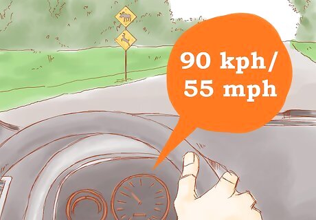 Drive at a safe speed. Do not speed when you are driving through moose or deer country. You'll still arrive if you go more slowly and you'll have more time to avoid an animal if you spot it. Wildlife experts have recommended 90 kph/55 mph as a suitable speed for wildlife zones in good weather conditions, as it provides you with some reaction time to stop. Here are the things that suffer when you travel at too great a speed: You can't stop quickly enough to avoid a collision. The impact of a car/truck is far greater the faster you travel. Your ability to take evasive action is massively reduced and you're more likely to resort to swerving instead of braking and gently responding.