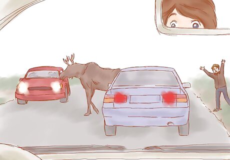 Slow down when other cars are behaving differently. If you see flashing lights (hazard or headlights), hear tooting horns or see people waving madly about, slow down and be ready to stop! Of course, if a car stops suddenly ahead of you, you should also stop or at least slow right down. In these situations, the other cars may well have stopped because animals are already crossing the road ahead of you.