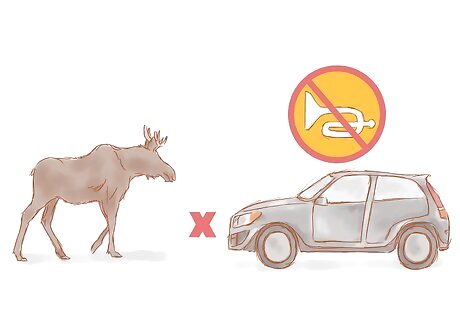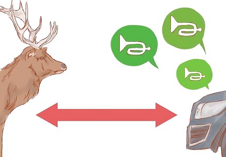 Honk your horn at the deer or moose in short bursts. Only do this if the deer is far enough ahead and there are no cars around that can be disoriented by the honking. This may scare the deer away, but there's no guarantee that it will make the deer run off the road. If you're quite close to the deer, you may want to avoid honking at it, because the deer may get confused and come closer to you.