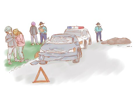 Take care after a collision with a deer or moose. There are some important steps to take after assessing if everyone is relatively unharmed: Pull over if possible. Put your hazard lights on and if you can, put the headlights onto the animal or as close as possible. Check passengers for injuries and treat accordingly. Even if there are no injuries, shock will probably occur fairly quickly. Try to reassure one another and if it is cold, put on warmer clothing immediately as shock or fear increases the inability to ward off cold. If it is winter, stay in the car for warmth. Avoid going near the animal; it may kick or gore you from fear and pain. If it blocks the road, use your hazard lights and headlights and keep your car stationary. Only attempt to move the animal if you are 100% certain that it is dead. Use road flares or triangles if you have them. Call the police immediately or flag down help. Remember that most insurance companies won't pay for the damages you suffer from hitting a deer or a moose if you don't file a police report.