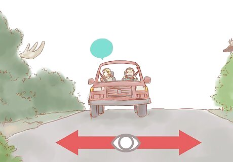 Observe your surroundings. Actively scan the sides of the roads as you drive for any signs of wildlife. If you have passengers, get them involved but ask them not to shout out as this is very startling and can cause the driver to react incorrectly. Ask them to calmly tell you that they see moose or deer lurking about. Look on the road sides, the shoulders, down into ditches (they love the grass there), median strips, intersecting roads, on the road itself and try to spot any signs of movement, flashes of eyes or body shapes. Watch both sides of the road; there is some evidence that drivers tend to watch the side of the road next to the passenger seat more than their own side, making a false assumption that only one side is a problem. Scan both sides! Drivers are responsible for scanning the area ahead of them as if they are a catcher on a baseball field scanning the left and right field. When driving at night, it is necessary to look for things that could dart into the road, such as animals, children, or cars reversing from driveways. So scanning from the proximity of the left mirror across to the right mirror and back again is an important part of previewing the road and making sure that you are aware of obstacles that could jump out.