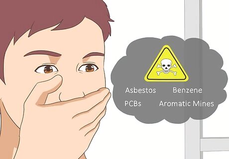 Avoid exposure to known carcinogens in your environment. You might encounter carcinogens at home, outside, or in your workplace. You can check lists of carcinogens maintained by The National Toxicology Program, the International Agency for Research on Cancer, and the Environmental Protection Agency. You can also check the American Cancer Society’s website. At work, make sure you aren’t exposed to carcinogens like asbestos, benzene, polychlorinated biphenyls (PCBs), or aromatic amines. Avoid bringing potential carcinogens into your home by checking the lists of carcinogens regularly. This allows you to avoid using products, like cleaners, that may contain carcinogens. Check your home for radon, which exposes you to radiation. Similarly, limit your exposure to medical tests that involve radiation. Drinking unsafe water or breathing polluted air can also put you at greater risk of developing cancer and other health problems. Check air and water conditions in your area and take health precautions (such as drinking bottled water or wearing a mask) if necessary.