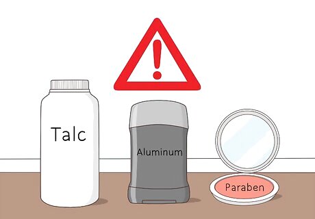 Avoid potentially carcinogenic personal hygiene products. Some cosmetics and other personal care products contain ingredients that may increase your risk of cancer. Before you purchase or use a product, take a close look at the ingredient list. Avoid products containing potentially cancer-causing ingredients such as: Talcum powder or other talc-based products. Talc is a common ingredient in many cosmetics and body powders, and talc-containing products have been linked to certain types of cancers. Aluminum-based compounds. These compounds are the active ingredient in many antiperspirants and deodorants. While it’s not clear that there is a strong link between aluminum-based products and cancer, you may wish to use aluminum-free products just to be safe. Parabens. These estrogen-like chemicals are found in many cosmetic products. While there’s no clear link between parabens and cancer, it is possible that they might contribute to hormone imbalances that could put you at risk.