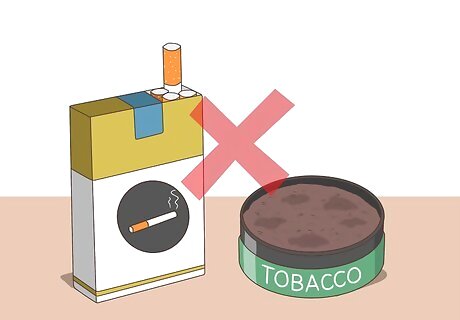 Stop using tobacco products if you haven’t already. Smoking or chewing tobacco are leading causes of several different types of cancer. You likely know that smoking and chewing are harmful to your health, but quitting can be very difficult. Luckily, you don’t have to quit on your own! Talk to your doctor about quitting aids, such as patches, gum, and prescription medication. You can also join a support group for people who are quitting or have already quit. If you don’t smoke, stay away from second-hand smoke.