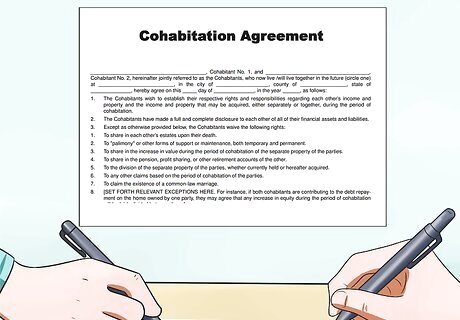 Sign a cohabitation agreement. You and your partner should draft and sign a cohabitation agreement, which is a document that specifies your rights as a couple and safeguards each person's individual interests and assets. The agreement should include a section that clarifies your relationship status and states that you are not agreeing to be married. A cohabitation agreement should include sections on how household expenses and property accumulated during the relationship will be split; and set forth procedures for a breakup. Within this agreement, include a provision stating: "Our relationship shall not be construed as a common law or informal marriage, and by living together and holding ourselves out as being a couple we are not agreeing to be married." The Texas legislature has not specifically addressed the legal issues surrounding cohabitation agreements, but they are likely to be upheld in court as valid contracts. Apart from those requirements, an enforceable cohabitation agreement is just like any other contract and must conform to your state's contract laws.