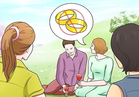 Be aware of how you talk about your relationship with other people. When interacting with others in public, make sure you do not claim you are married. The following examples will give you a good idea of what not to do: When you move in together, do not tell your neighbors or house guests that you are a married couple. When you are at social gatherings, do not introduce your significant other as "your spouse."