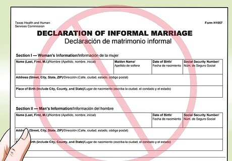 Do not file any common law marriage documents with a Texas court. You and your partner should avoid filing certain documents with a Texas court, and you should avoid asking a Texas court to recognize a common law marriage. Doing so will result in the state recognizing a common law marriage. The important documents you should avoid filing and the proceedings you should avoid are: A Declaration of Marriage. This is a document that formalizes a common law marriage. It may also be referred to as a Declaration of Informal Marriage. This document asks you to fill out, sign, and date a declaration stating that you meet all of the requirements of an informal marriage. A Recognition of Common Law Marriage. This is a type of proceeding before a judge whereby you ask the court to recognize a common law marriage for a specific purpose, such as when you are filing for divorce. When you go to the court hearing, you will most likely have to fill out a declaration of marriage form and file it with the court. Agreements signed as a married couple. You should also avoid filing any documents with a court that have been signed by you and your significant other as a married couple. Examples include leases, life insurance policies, and tax returns.