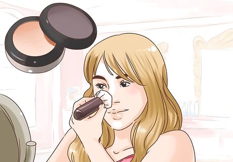 Apply powder strategically. Using too much setting powder can give you a cakey look that highlights pores, fine lines, and wrinkles. To set your foundation, only dust powder over the areas where you tend to get shiny or oily. For most people, that is the T-zone, or forehead, nose, and chin. You may also want to apply a light layer to your cheeks. If your skin is dry, you may want to skip powder completely. It can be very easy to apply too much pressed powder or powder foundation.To keep your powder from looking too heavy, opt for a loose, translucent formula that won’t add any color or coverage.