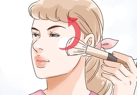 Sweep your blush higher up on your cheek. If you place your blush too low on your cheeks, you’ll wind up looking harsh and dragging your face down. Start at the apple of your cheek, and blend it back along your cheekbone toward your hairline. Start with a small amount of blush, and only add more if you need more color. Be sure to blend well too, so it melts into the skin for a natural look. An angled blush brush is helpful for getting the right placement of your blush.
