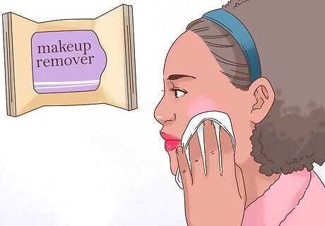 Remove your makeup at the end of the day. Sleeping in your makeup is one of the worst things that you can do for your skin. It can cause breakouts, fine lines, and wrinkles, and leave your complexion looking dull. Always wash your makeup off at the end of the day with a good cleanser to keep your skin healthy. If you’re wearing waterproof eye makeup or heavy foundation, it’s best to incorporate a specific makeup remover into your skincare routine before you wash your face. Keep makeup remover wipes on your nightstand. That way, if you’re too tired to stand over the sink and wash off your makeup at the end of the day, you can quickly wipe it off and get to bed.