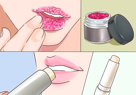 Exfoliate and moisturize your lips before applying color. Whether you want to apply a lipstick, stain, or gloss, the color won't look right if your lips are dry and flaky. Use a lip scrub to gently remove dead skin from your lips, and apply a moisturizing lip balm before your lip color so it looks smooth and flawless. You can purchase a lip scrub or mix up your own with household ingredients. Combine 1/2 teaspoon (2.5 ml) of olive oil with 1 teaspoon (4 g) of sugar, and rub it over your lips to exfoliate. Wipe it away with a damp washcloth. It's particularly important to scrub and moisturize your lips before applying a matte lipstick. Matte lip colors are extremely drying, so they emphasize every crack and flake.