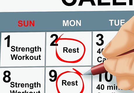 Include recovery days. You must rest in order to avoid over-training. Your muscles need time to recover each week. Make sure to schedule at least one recovery day per week. Add more if you need to. One rest day a week is recommended for regular exercisers. If you are new to exercise, schedule a rest day every third day. Every eight weeks, schedule a de-training week. This means that you will lift lighter weights or log less miles. Your body needs more significant periods of rest every so often. On your off days, do moderate activity. You can take a long walk or a restorative yoga class. Just don't count reps or miles. Your mind needs time to rest and recover from training, too.