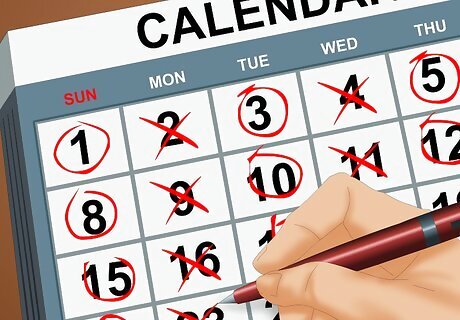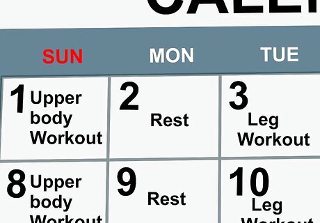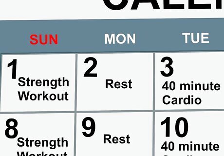 Make an adjustable schedule. Choose how many days a week you want to work out. If you are training for a specific event, you may want to try to workout most days of the week. If you are just beginning your fitness regimen, consider only working out 2-4 days a week. In order to avoid over-training, make sure to schedule a reasonable amount of training sessions. Make sure that your workout schedule fits your personal schedule. For example, are there days of the week that you absolutely cannot work out? Don't set yourself up for failure. If you will have a difficult time working out 6 days a week, don't schedule yourself for 6 workouts. Set goals that you can feel good about accomplishing. Make your training sessions a priority. Put each of your sessions on your calendar or in your planner. Commit to your training sessions the same way that you commit to anything else. If someone asks you to go to the movies during your scheduled session, say, "No, I'm busy at that time. Could we go later in the day?"