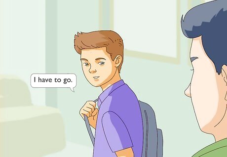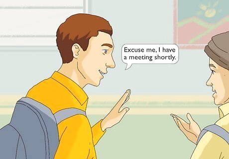 Treat everyone with civility. If you encounter someone you don’t want to talk to because this person is rude, or you two have a history, remember to stay polite. Being courteous and not letting someone’s attitude toward you goad you into retaliating is an effective way to keep any conversation short. You won’t always be able to completely avoid someone you don’t want to talk to. However, you can minimize your interactions with this person by keeping a polite poker face. Pause, and take a deep breath. Focus on yourself. Your goal is to end this interaction as quickly as possible. Politely excuse yourself from the conversation. Instead of acting similarly to this other person. Remain calm and say that you have to meet a friend or have an appointment. Then you can leave the situation.