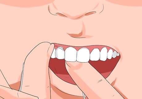 Curve the floss into a C shape when you reach the gums. Hold it against one tooth. Gently slide the floss into the space between the gum and tooth. Hold the floss tightly against the tooth. Gently rub the floss along the side of the tooth away from the gums using up and down motions. Repeat this method on the rest of your teeth. Don't forget space behind your last tooth in the back of your mouth.