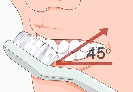 Brush all surfaces of your teeth. You will want to place your brush at a 45 degree angle to your teeth and gums as you brush. Don't apply too much pressure, or you could damage your gums. If you're bearing down with the brush or notice that your brushes fray quickly, you are likely using too much pressure. Start by brushing the front surfaces of all of your teeth. Use small side to side strokes. After you have brushed the front surface of all of your teeth, move on to the chewing surface and the backs of your teeth. To clean the inside surface of your front teeth, tip the brush vertically and use several up and down strokes. Make sure to brush along the gum line as well. You should also brush your tongue to remove bacteria and improve your breath.