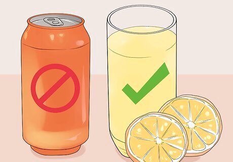 Drink fruit juices and carbonated soft drinks sparingly. Carbonated soft drinks are very high in sugar. Fruit juices often contain hidden added sugar, especially if they are called "fruit juice drinks" or "fruit juice cocktails." Avoid these. Carbonated soft drinks are also very acidic. Acids in drinks and food can break down enamel and increase the risk of tooth decay. While fruit juices are healthy in moderation, they contain a lot more concentrated sugar than whole fruit without the added benefit of fiber. Drink only 100% fruit juice with no added sugar. Research suggests that 100% fruit juice is unlikely to cause tooth decay. If you drink these items, make sure to do so with a straw to minimize contact with your teeth.