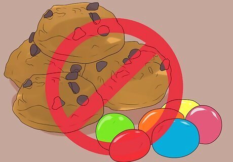 Avoid sugary candies, sweets, starches, and refined carbohydrates. Foods that are high in sugars promote plaque buildup because bacteria is attracted to sugars. If you do eat sweets, try to eat ones that don't stay in your mouth for too long. Candies such as lollipops, hard candy, and caramels tend to stay in your mouth for long periods as you suck on them. Snacks like cookies, cakes, and pastries also contain lots of sugar and can cause tooth decay. Foods such as bread, chips, pasta and crackers contain starches and refined carbohydrates that are sugars. If you do eat them, try to eat these foods only at mealtimes rather than as a snack between meals. If you do eat sweets and refined carbs, try to brush your teeth with a fluoride toothpaste afterwards.