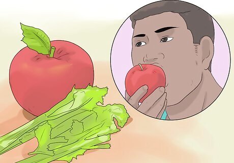 Eat plenty of fiber rich vegetables and fruits. These will stimulate saliva flow. Saliva is a natural defense against cavities as it prevents bacteria and plaque from sticking to your teeth. About 20 minutes after eating, saliva can begin to neutralize the acids that attack your enamel. Crisp fruits and vegetables such as carrots, apples, and celery are recommended.