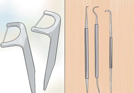 Try using floss picks, dental picks or wooden plaque removers if you find using floss difficult. These methods can help to remove plaque and food between your teeth without the difficulty of measuring out a piece of floss and maneuvering it between your teeth. A water pick helps to remove plaque and food from between your teeth and gums by using a stream of water to clean these areas. Floss picks are small plastic devices with a tiny bit of floss attached. You can use these to floss your teeth in much the same way as you would using string floss. If you are having trouble flossing, talk to your dentist about what options are available. You may just need to try a different type of floss (unwaxed vs. waxed etc.).