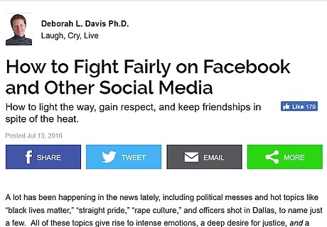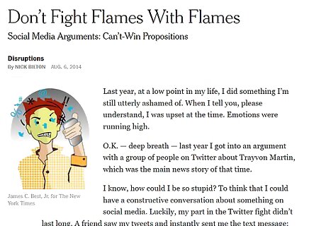 Ignore inflammatory remarks. If someone is posting deliberately offensive material, try to avoid responding. The person may be looking for an argument. By telling them off, you are not changing their mind but rather feeding their desire for attention. For example, if someone says, “Everyone who supports this team is an idiot,” you may want to ignore it and move on. If you see someone posting hate speech, the best thing you can do is not engage them personally. Report them to the website. If they are threatening violence, call the police.