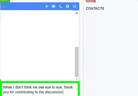 Thank them for their opinion. Sometimes, it is more civil just to thank someone for their opinion without engaging with it. Thank them for expressing their opinion, and do not engage with them further. You can say, “While I don’t think we see eye to eye, thank you for contributing to the discussion.” You can also try saying, "I think we will have to agree to disagree, but I appreciate you taking the time to talk to me about it."
