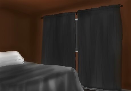 Keep your bedroom dark, cool, and quiet. Put up heavy curtains or shades to block the light from windows. Cover any electronic displays, like tvs or computers so the light does not glow in the room. You can also use a sleep mask to cover your eyes to help you sleep. If you have difficulty sleeping due to loud noises outside your window or a loud sleep partner, consider investing in good earplugs, or a noise machine.