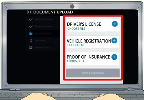 Upload the required documents. After entering your social security number, you'll be prompted to upload copies of your required documents. You can take clear pictures with your smartphone or digital camera and then transfer them to your computer for upload, or you can use a scanner. Make sure that the pictures are clear and that all of the text on your ID and documents are legible. You'll need to upload your driver's license, vehicle registration, and proof of insurance. The vehicle registration and the insurance must both be in your name. Some cities may require additional documents, such as a business license or minicab licence.