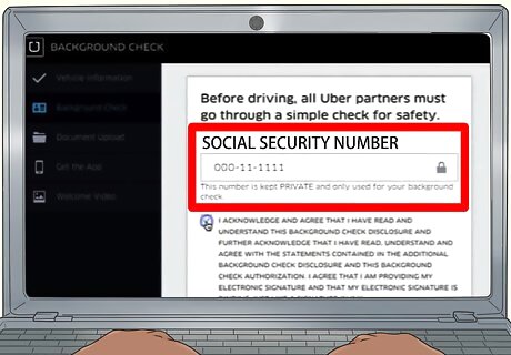 Enter your social security number. This is required in order to perform a background check. You cannot become an Uber driver without a social security number. The background check is free, and may take a week to process. There is no credit check involved.