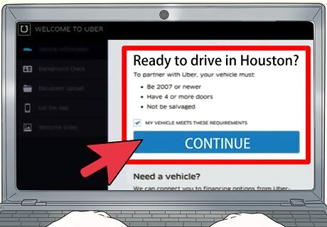 Confirm your vehicle meets your city's requirements. The first thing you'll be asked is if your vehicle meets the requirements for your city. If it does, click Continue. If it doesn't, you won't be able to use that vehicle with Uber.