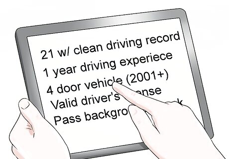 Determine if you are eligible to drive. You must meet several requirements in order to even be considered as a driver for Uber: You must be 21+ with a clean driving record. You need to have at least one year of driving experience in the US, three if you are under 23. You must have a four-door vehicle with four passenger seats that is 2001 (Y/51) or newer. 2001 is the base year, and some cities will require newer models. For example, Houston requires a 2007 or newer vehicle. You must consent to and pass a background check. You must have a valid driver's license and your car must be insured in your name.