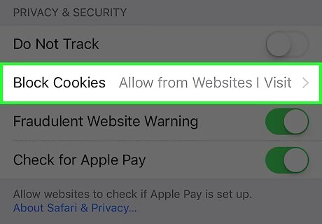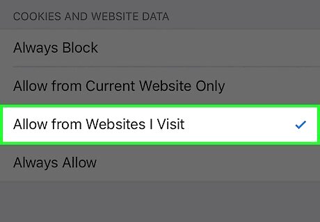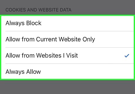 Select your preferred block option. Blocking cookies will prevent websites from collecting data--such as your location, frequently-used passwords, and other contact information--from your browsing sessions. Disabling cookies also means you'll need to log into your accounts each time you restart your phone's browser since the sites won't remember your login information.